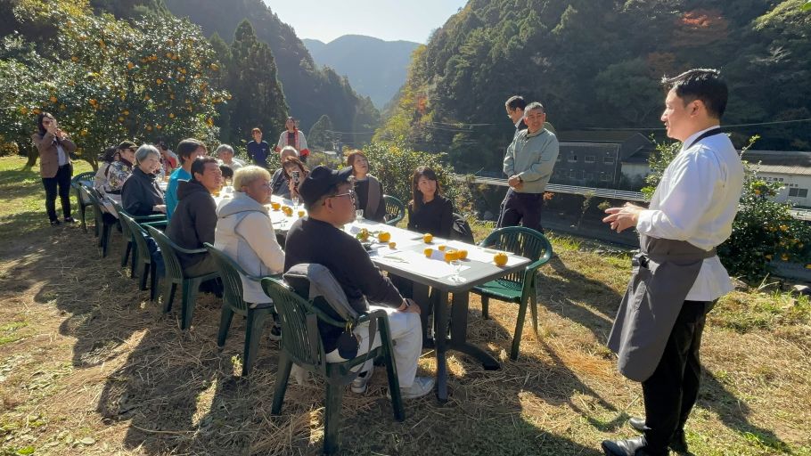 当日は雲ひとつない晴天。ゆず畑の中にテーブルを並べた屋外レストランで、ゆずの香りと開放感 が参加者をもてなしました。料理を手掛けたのは、在スロバキア日本国大使館の元公邸料理人である江口直樹シェフと、地元の食材を知り尽くした馬路温泉の山中理啓料理長。 この日のために考案された9品のコース料理は、「安田川のウナギとゆず大根」「アユの身にゆず皮を詰めた春巻き」などで、世界基準の調理技術とローカルな素材を融合させた特別な食事体験となりました。参加者からは「普段食べ慣れたゆずが、一流の技でここまで進化するとは」「自然の中でこれほど贅沢な時間は初めて」と、感動の声が上がりました。