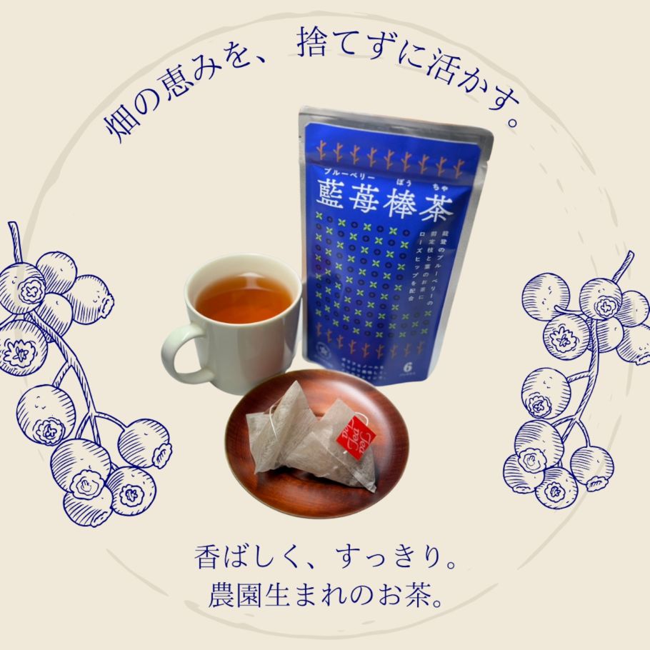 ZESDAが支援しているひらみゆき農園が、新商品「藍苺(ブルーベリー)棒茶」を発売しました。「藍苺棒茶」は、ブルーベリーの剪定作業で生じる「枝」や「葉」を活用した、アップサイクル商品のお茶で、通常は廃棄されたり、土に還元されることの多い素材を、無駄なく活かしたお茶として開発したものです。また、この商品は農福連携に取り組むリハスファーム白山が計量・袋詰めを担当。ZESDAが支援するプロジェクト同士のコラボレーションとなっています。